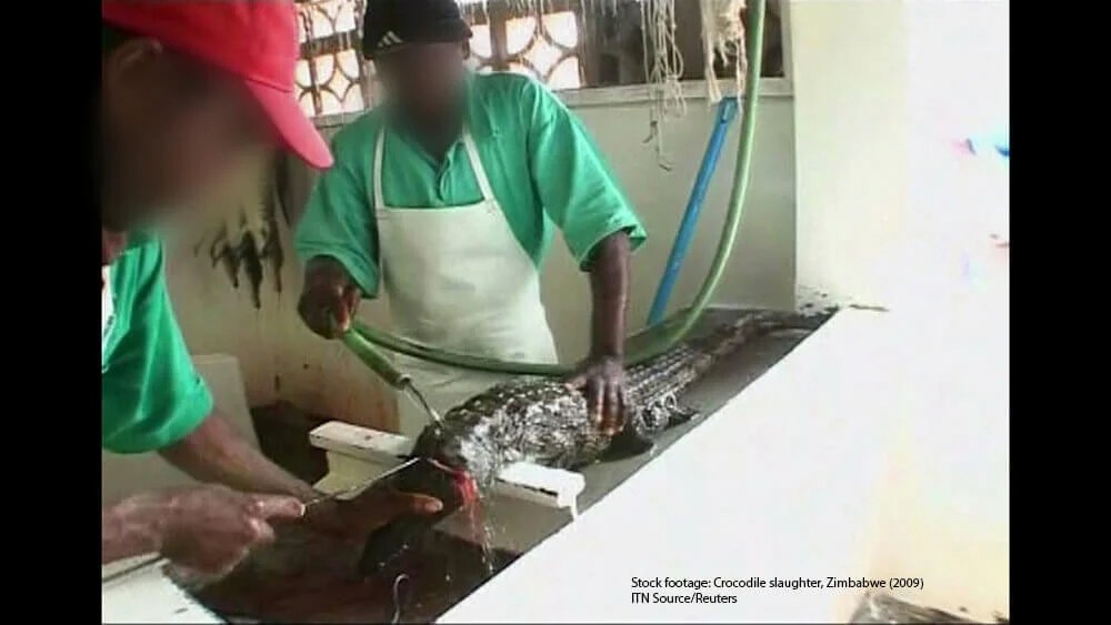 PETA investigators uncovered the horrifying conditions under which animals are reared and/or killed for “luxury” products such as watchbands, belts, and Birkin bags, from Texas to Zimbabwe. Before they are eventually killed for their skins, crocodiles and alligators are housed in dreary concrete pits for months or even years. In the name of “luxury,” a PETA investigator found that workers attempted to mutilate some alligators’ brains with metal rods and savagely cut into their necks. Some animals had been attempted to be killed for minutes, but they were still aware, thrashing and kicking. The following activities by employees there were recorded by our investigator: